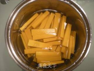 南瓜切条,放锅中焯熟,沥水。(南瓜条不能煮的太烂,要不炒的时候就不成形了)