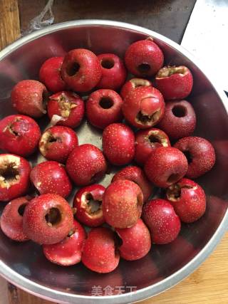 糖熬黄,倒入山楂,撒上玉米淀粉