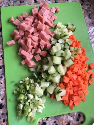胡萝卜、黄瓜、香葱切丁,葱白切碎