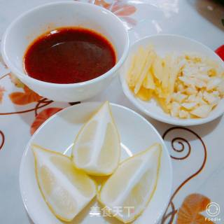 准备调一碗汁:3勺奥尔良调味料,1勺酱油,1勺蚝油,0.5勺老抽,2勺花生油,蒜蓉辣椒酱1勺,少许盐混合在一起。蒜头米切碎,姜切条,柠檬一个切块。