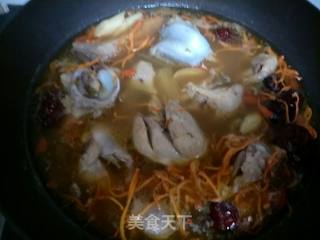 汤熬一个小时后,加入适量虫草花,加盐适量,小火熬15分钟即可出锅!