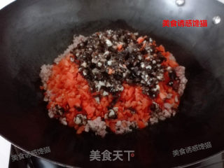 炒锅放油,放入肉末炒至8分熟,放胡萝卜、香菇、木耳炒熟,放盐、生抽、老抽、蚝油、十三香翻炒匀。