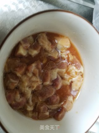 牛肉切丁放入碗中,加入少许白胡椒粉、酱油、色拉油、淀粉、水,抓揉5分钟,腌制1小时