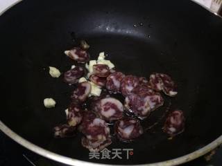 倒入腊肠和蒜碎,快速翻炒几下。