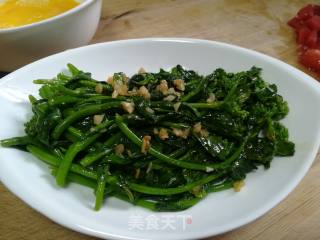 锅里放两滴油,不粘锅就好,烧热,放入蒜末,炒出蒜香,放入菜,加入蚝油,翻炒几下就可以出锅了