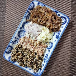 把鱿鱼粒、香菇粒、葱蒜末、五花肉粒炒香,待用。