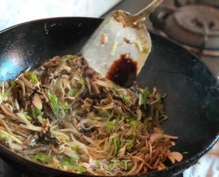 然后把鳝丝倒进去中火炒,期间加少许油,炒的时候注意不要粘锅,直至鳝丝水分煸干。