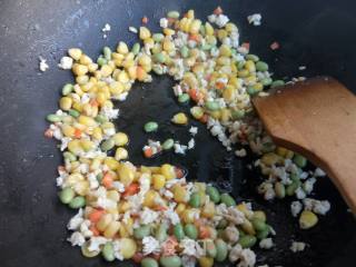 锅中加油,温油滑炒鸡蓉。不要把鸡蓉全部放里炒,一点点划散,不要炒成块。加玉米粒、青豆、胡萝卜翻炒。