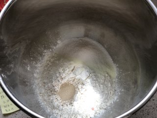 除蔓越莓和黄油外的食材放入厨师机桶内,盐和酵母分开。