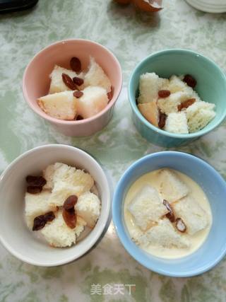 把面包丁摆入烤碗,撒一层葡萄干,倒入布丁液,泡一会,使面包丁充分吸收布丁液。