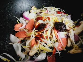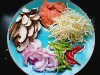 香菇火腿洋切片,洋葱青红椒切丝,绿豆芽洗净。