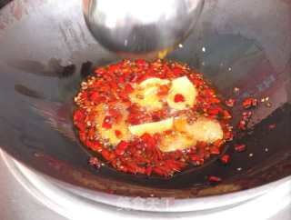 锅里面放食用油、放干尖椒、花椒、姜片,花椒和干尖椒煸香。