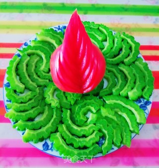 “ 摆盘是一种艺术。满满一大盘食物(毫无美感)盛盘上桌给人一种廉价感,而不同颜色、不同食材、不同形状的摆放清析的层次感起到了装饰作用且诱人食欲、简单的苦瓜摆盘、西红柿花搭配视觉与色泽提升了盘饰的整体效果。 ”