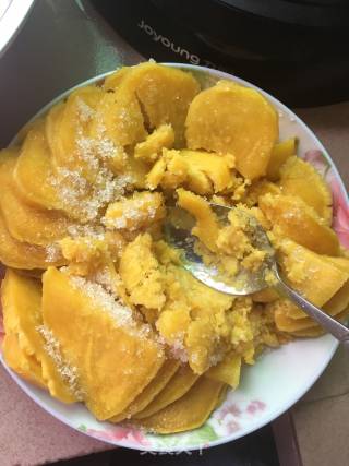 趁热撒上白糖,今天买的红薯不怎么甜,所以我放了比较多的糖。用勺子搅拌均匀。