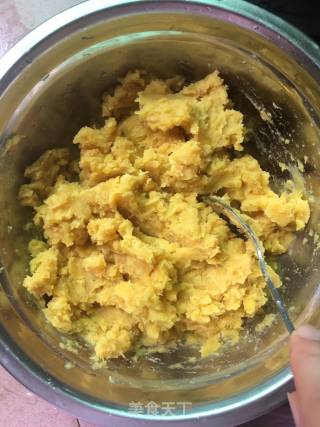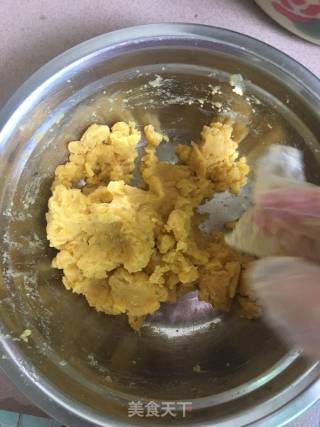 然后倒入65克糯米粉,如果红薯泥水分比较多的话,可以多放一些糯米粉,这个没有规定的,根据自己的量慢慢调和。