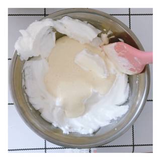 将三分之一蛋白霜加入酸奶糊中,翻拌均匀,不能画圈,会消泡。