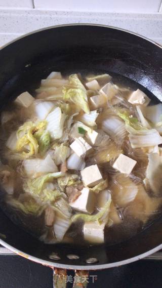加入粉条加入水,水量跟菜量持平,在加入酱油,蚝油,加盖大火炖15分钟,时间可以根据你泡的粉条时间,粉条熟了即可。