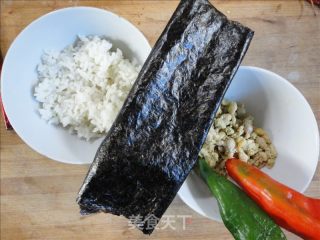 再放上另一张紫菜压实了,放上炒好的豆丹。