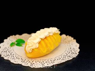 装上花嘴+奶油、先在面包中间挤上一条奶油,再在上面挤上一个S型花纹即可。