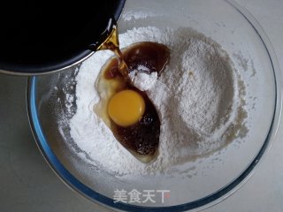 面粉、泡打粉混合倒入和面盆里,磕入一个鸡蛋,倒入已经放凉的红糖水。