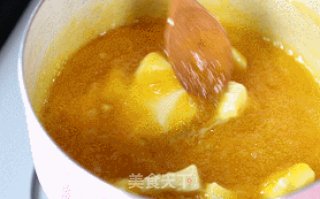然后再次开小火加热到沸腾,一直煮到较为浓稠的状态,中途一定要不停的搅拌防止粘底。