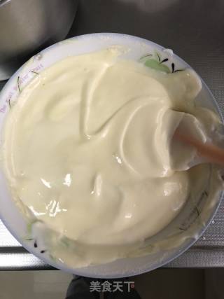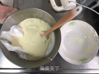 取三分之一的蛋白加入到乳酪糊里,用硅胶刮刀从下往上翻拌均匀,千万不要打圈圈去搅拌!打圈圈搅拌容易消泡导致蛋糕会塌掉。