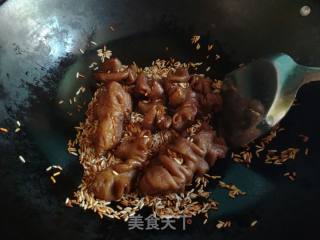 大米小火炒至焦黄,倒入滤干水的肥肠。