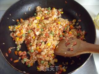 3、 炒饭时可以按口味,将番茄酱按成咖喱味道也不错。