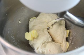 面团揉至较光滑状态,加入软化的黄油,低档揉至黄油吸收后加入盐,转4-5档揉面。
