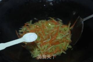 起油锅加热,放入胡萝卜丝煸炒炒透。