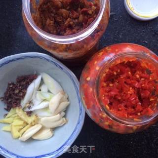 炒锅入油烧热,放入葱姜蒜,自制辣椒和剁椒炒香。