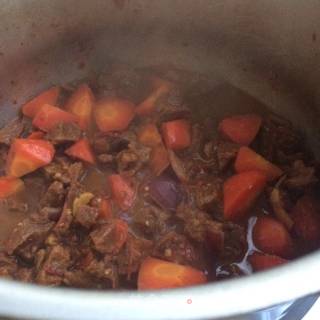 牛肉熟后跨入洋葱和红萝卜粒炖熟。