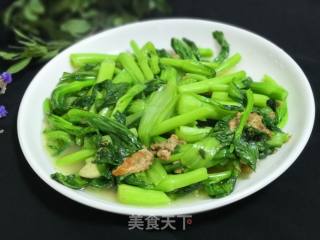 菜心沥干水份,倒入与油堆一起大火煸炒一分半