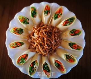 干豆腐平铺,菜放在干豆腐一端码好,稍紧一些卷成卷。