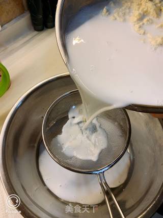 待容器里的清水混稠时,把洗面水用滤网滤到另外的干净容器里。滤网里的渣也别扔,那是面筋,在加入200克清水继续揉捏面团