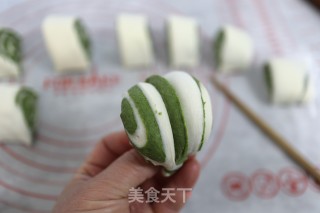 艾草面团因为艾草浆中含了很多叶子末,影响了面筋的形成,所以拉不出透明薄膜,只好将计划好的面包改成了中式花卷;