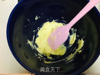 低粉与泡打粉提前混合后筛入到黄油糊中,搅拌至无明显干粉即可,切勿过度搅拌。