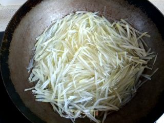 锅中放入适量清水烧开,放入土豆丝,烫至土豆丝变透明即可捞出,不要太软。