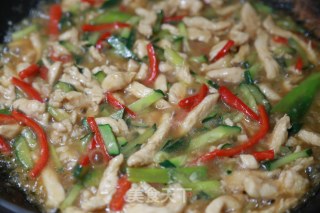 加入黄瓜丝、红辣椒丝和葱段,翻炒几下。