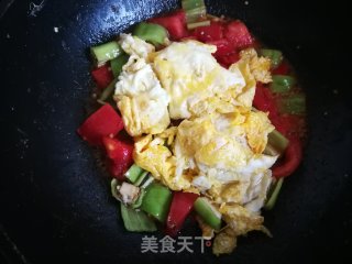 炒鸡蛋留下的油,西红柿和青椒放入翻炒片刻。