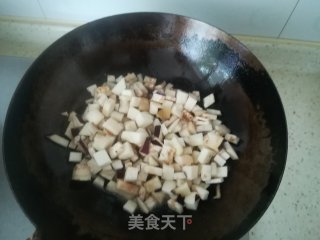 倒入茄丁,肥瘦肉丁,放入甜面酱,生抽,料酒,白糖炒匀