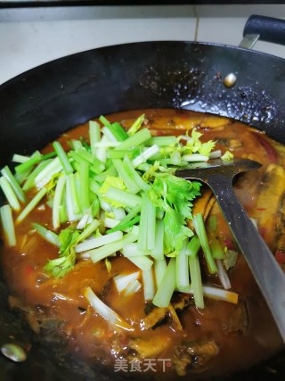 加入芹菜段,开大火收汁儿,第二次调味,咸味不够加点盐。