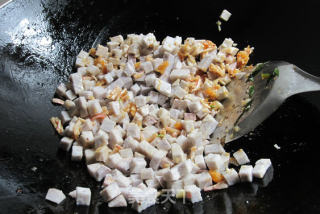 鱿鱼丝一变色就下香芋粒,如果把鱿鱼炒熟在放后面的材料,鱿鱼就过火了,那样吃起来鱿鱼就像橡皮筋。