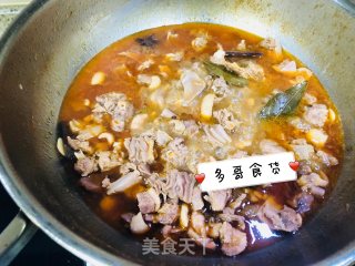 下油锅,小火将大蒜、八角、桂皮、香叶花椒和少许大葱爆香。