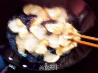 锅烧干加入食用油,待油温能炸的时候放入拌好的红薯片,炸至成金黄色捞出即成。