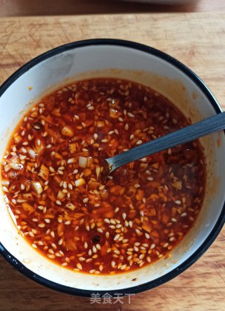 锅中放入一勺油,炸香几粒花椒。 把热油炝进蒜蓉碗中。