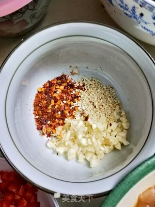 另取一碗放蒜蓉,白芝麻,辣椒粉,用热油沷入,放酱油,芝麻油,醋,调成汁