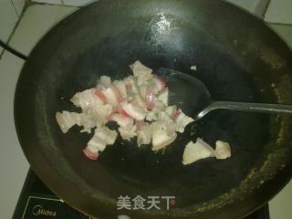 3、炒至肉片出油,稍微焦黄后下蒜粒炒,