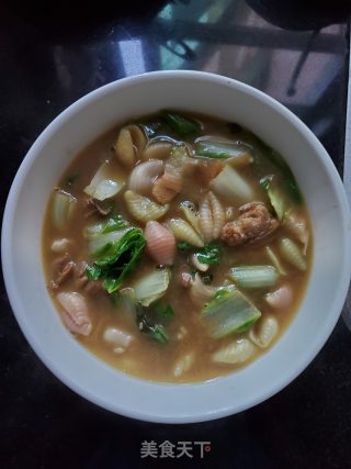 汤汁香浓配滑溜溜的贝壳面添加了当季小白菜营养加分。