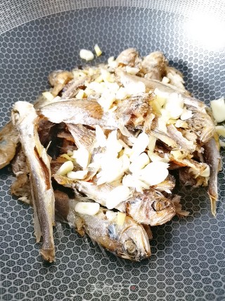 另起锅烧油,放煎好的黄花鱼入锅中,加姜粒和蒜末,翻炒均匀